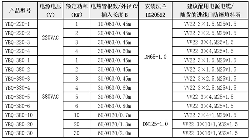1)接线盒内设置有加热元件表面温度防超温的限温器,容量250V20A。220V4KW以下供电只需直接接入电源线,限温器和加热元件串联直接控制防超温。3相380V供电时,限温器作为1对干接点,需通过控制电缆接到用户的控制系统里二次控制加热元件防超温,控制电缆进线口为M20*1.5,随货配有防爆填料函,建议控制电缆:KVV 3*1.5。